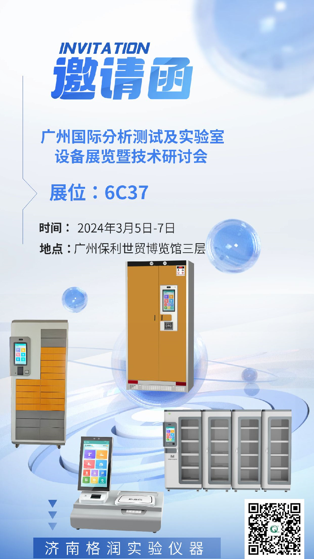 格润公司将于2024.3.5-7参加广州国际分析测试及实验室设备展览会。地点:广东省广州市海珠区新港东路1000号广州保利世贸博览馆三层。展位号:6C37。格润公司将携智能柜,净气柜等产品亮相,还有精美礼品相送,诚邀您莅临参观指导。